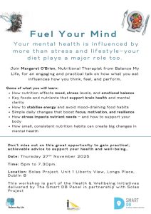 The second workshop, Fuel Your Mind, will be led by nutritional therapist Margaret O’Brien from Balance My Life. Margaret will explore the relationship between nutrition and mental wellbeing, highlighting how our food choices influence mood, energy, focus and resilience. Participants will learn about foods that support brain health, how to avoid habits that drain energy, and simple daily changes that can make a real difference. The workshop is engaging, practical and suitable for anyone interested in understanding how diet can support overall wellbeing.