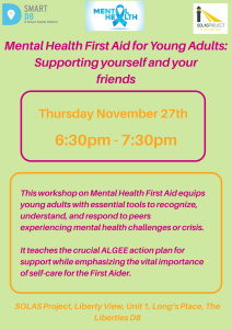 As part of the programme, Smart D8 tutors will host two workshops that are free and open to anyone attending. The first, Mental Health First Aid for Young Adults, will be delivered by Kieran Doyle. This session introduces the key principles of Mental Health First Aid, giving young adults the tools to recognise when a friend or peer may be struggling. Kieran will guide participants through the ALGEE action plan and discuss ways to offer effective support, while also emphasising the importance of self-care for those who provide help to others.